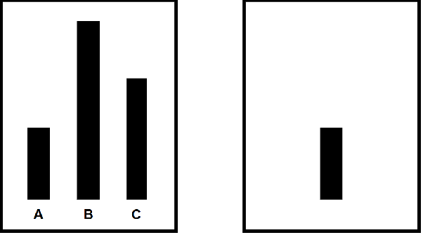 Es wurden Karten ähnlich dieser gezeigt und alle Testpersonen sollten sagen, welcher Strich der linken Karte die gleiche Länge hat, wie der Strich der rechten Karte. Es lässt sich bemerken, dass der Unterschied leicht mit bloßem Auge erkennbar ist.
